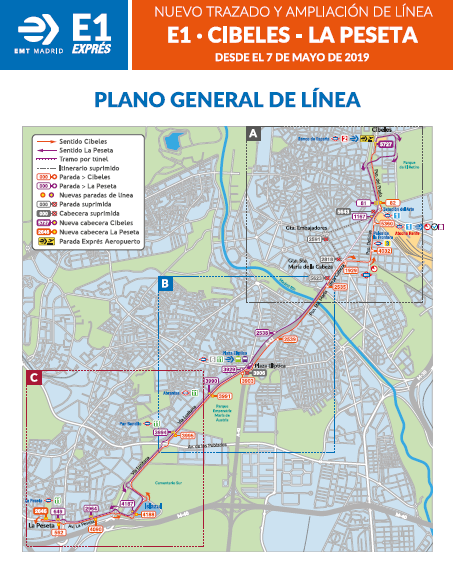 Hoy 7 de mayo la Empresa Municipal de Transportes pone en marcha la ampliación de la línea E1 por sus dos extremos, de modo que esta línea cubre el trayecto entre Cibeles y la estación de Metro de La Peseta.