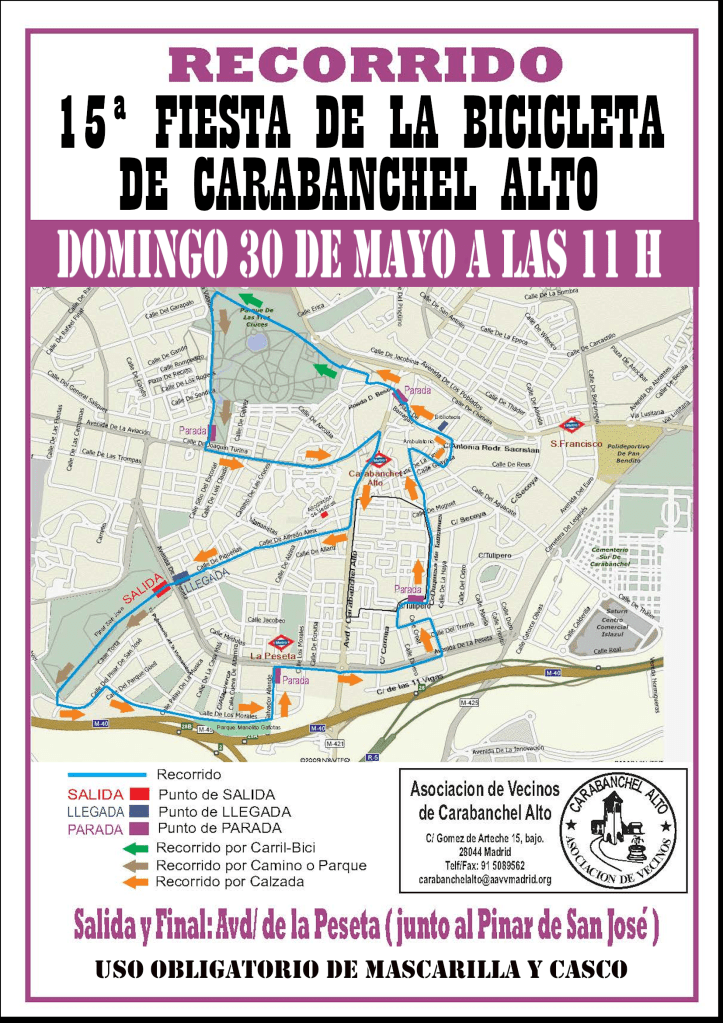 El próximo domingo 30 de mayo celebramos la 15ª Fiesta de la Bicicleta de Carabanchel Alto. La salida tendrá lugar a las 11 en la entrada del Pinar de San José de la Avda. de la Peseta. Este será el recorrido: