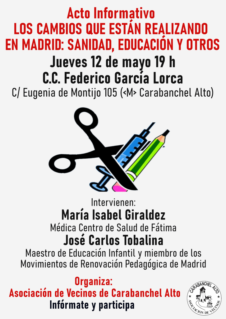 El próximo jueves 12 de mayo a las 19 h tendrá lugar el Acto informativo «Los cambios que están realizando en Madrid: Sanidad, Educación y otros» en el Centro Cultural García Lorca (C/ Eugenia de Montijo 105, <M> Carabanchel Alto, L11).